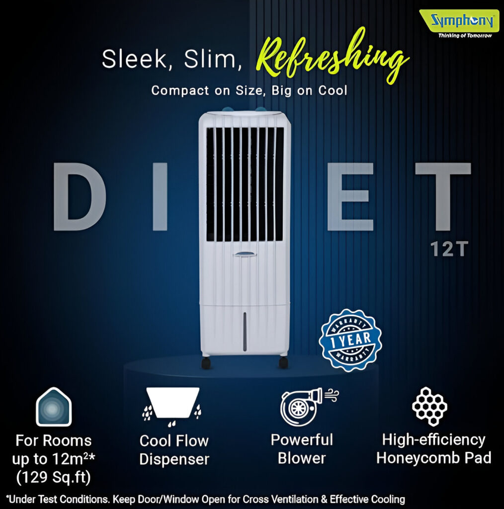 When it comes to beating the summer heat in small rooms, the Symphony Diet 12T Personal Tower Air Cooler stands out as one of the best quality air coolers under ₹6000. With a slim design, powerful blower, and energy-saving performance, it’s perfect for bedrooms, kitchens, or personal workspaces.
